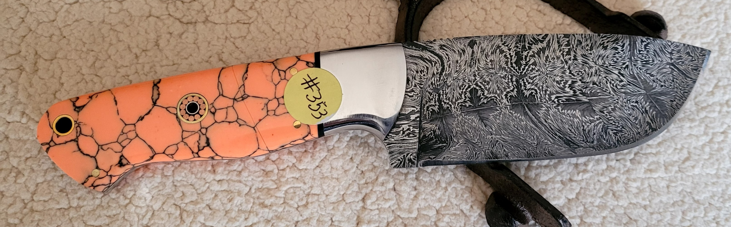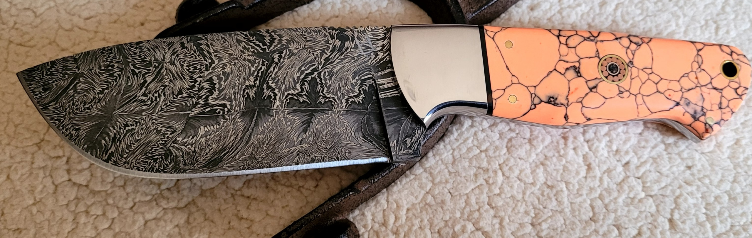 Handmade skinner with mosaic pattern on the blade.  Handle is a tangerine resin with black webbing with one large mosaic pin, 3 brass pins and a nickel bolster with a black inlay in between the bolster and the handle.  Damascus has 512 layers of 1095 high carbon and 15N20 nickel.  Blade length is 4 1/4″, blade width is 1 5/8″ with an overall knife length of 9″.  Comes with a leather sheath that can be worn horizontally or vertically.  Sheath has a loop for a flint rod (sold separately).