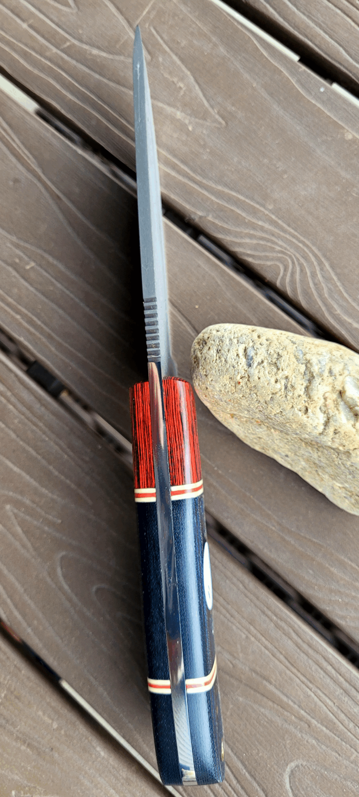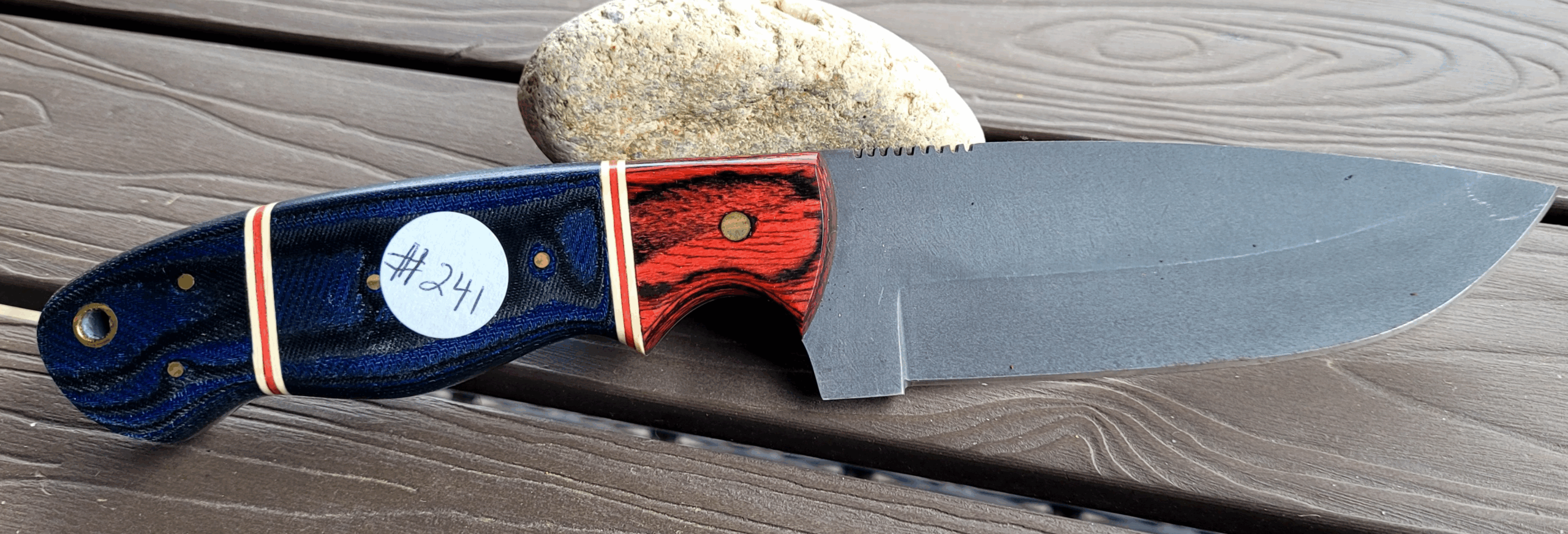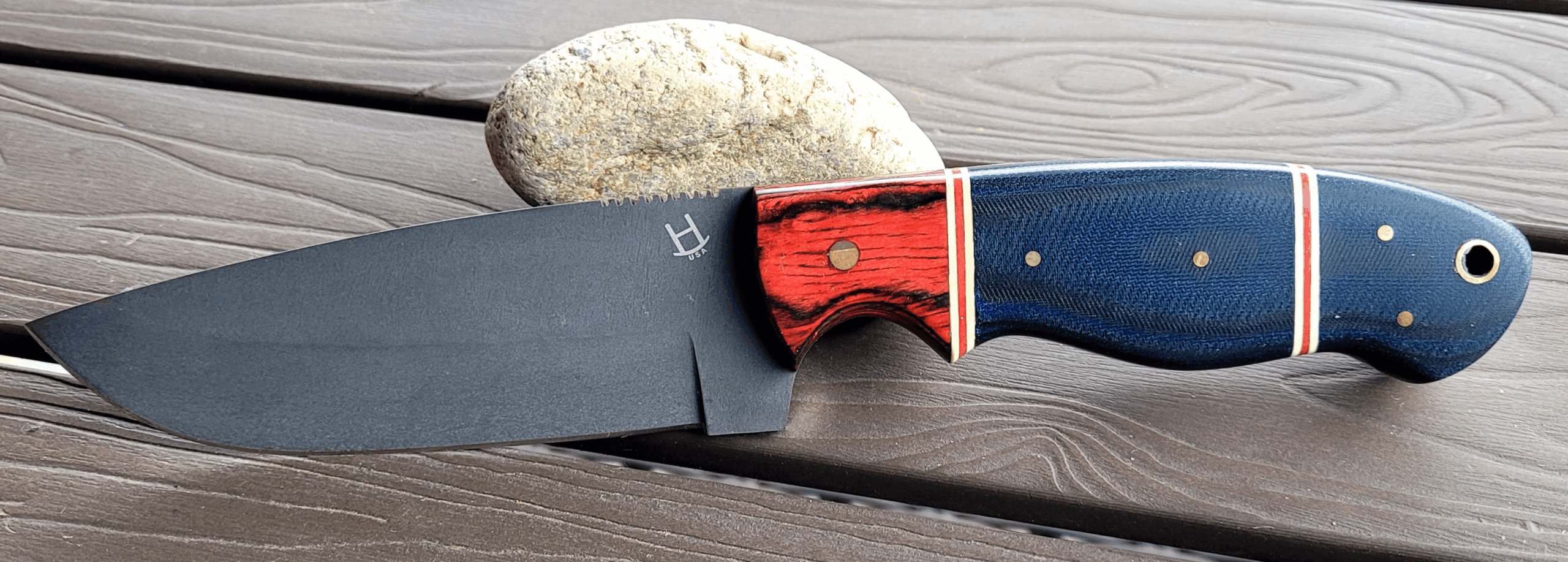 Handmade drop point skinner with Gl0 micarta handle and pakkawood bolster. Handle has 2 set of red and tan inlays and 5 brass tacks. Blade is made from D2 tool steel and has been anodized to a charcoal gray finish. Blade length is 4 3/4″ with an overall knife length of 9 1/2″. Comes with a leather sheath that can be worn horizontally or vertically. Sheath has a loop for a flint rod (sold separately).