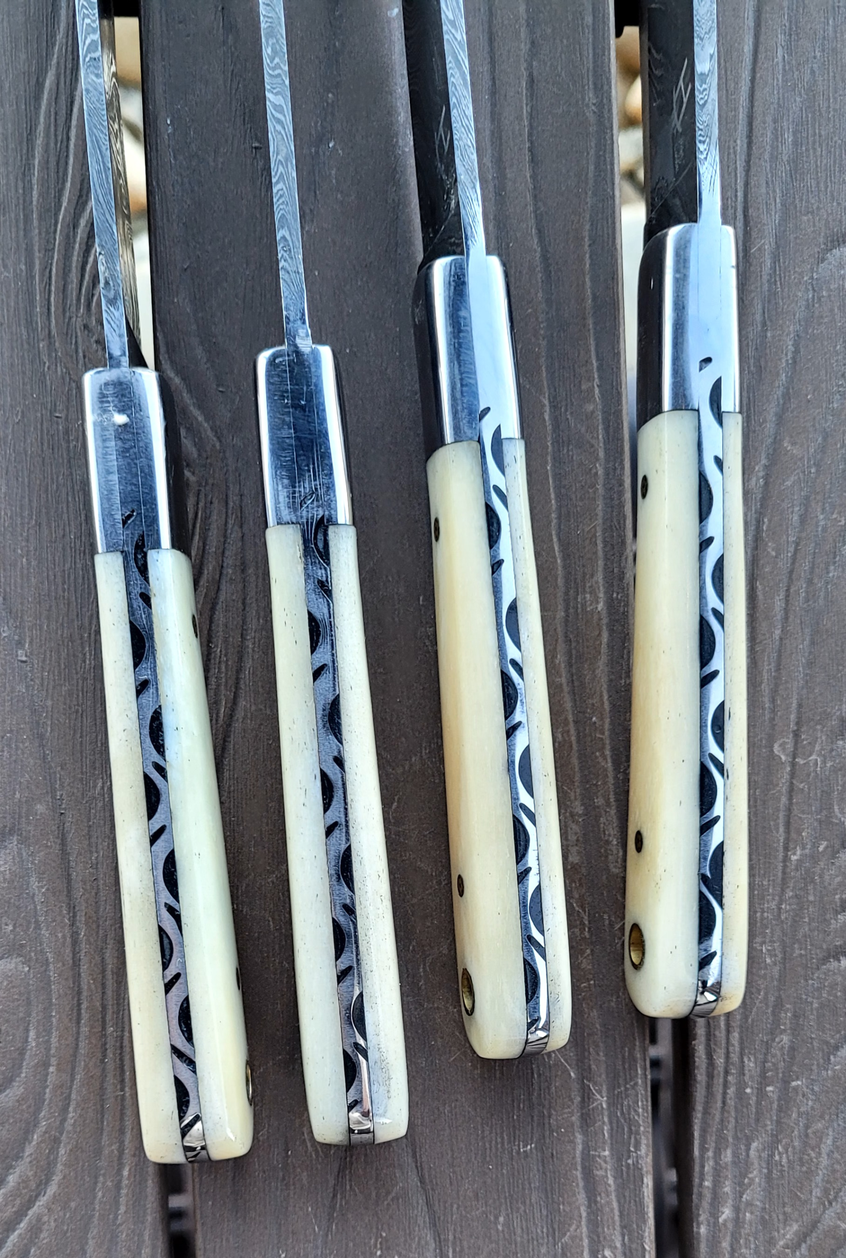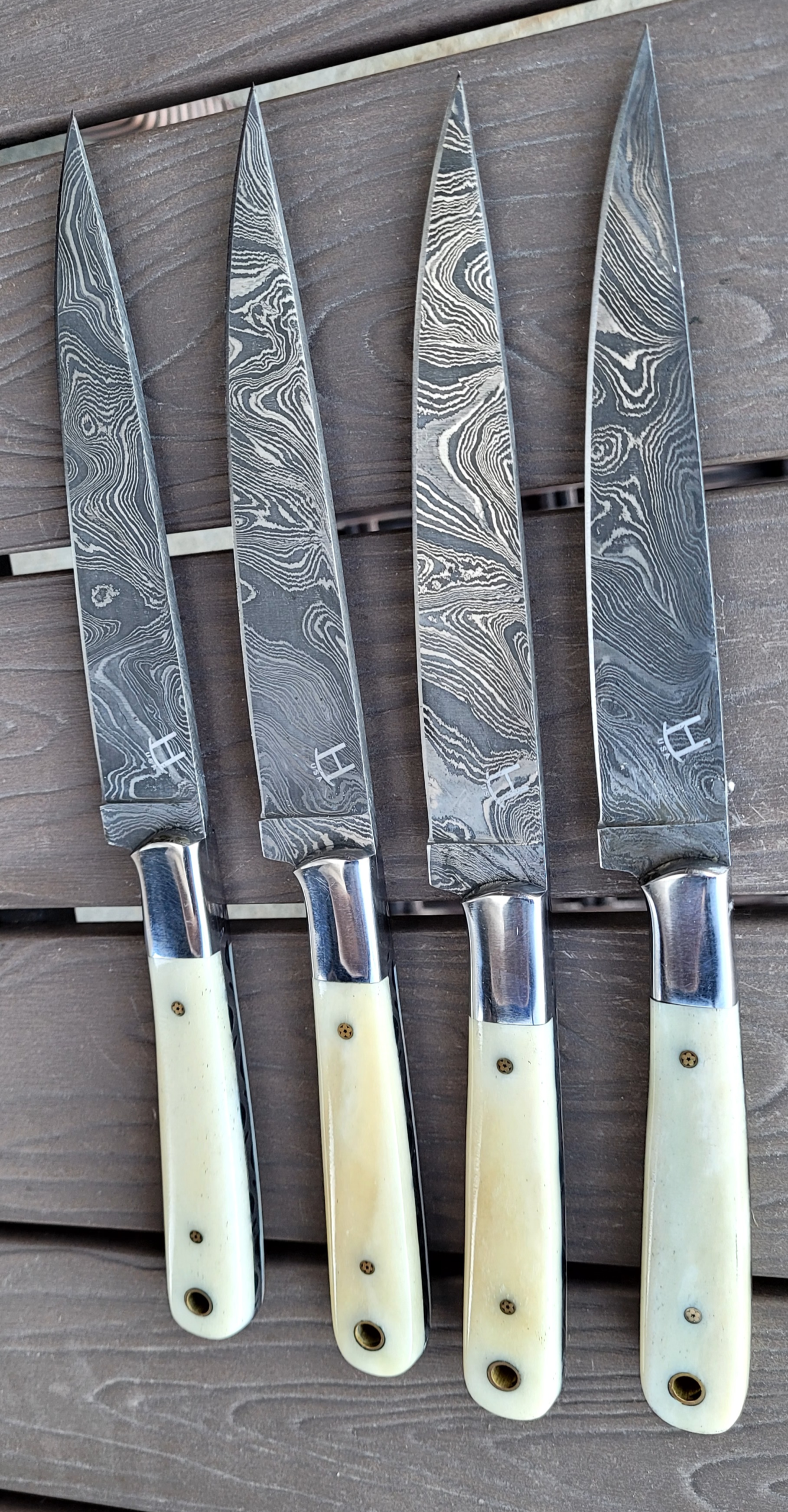 Set of 4 handmade damascus steak knives with camelbone handles.  Damascus has 512 layers of 1095 high carbon and 15N20 nickel.  Blade length is 5 1/2″ with an overall knife length of 9 1/2″.
