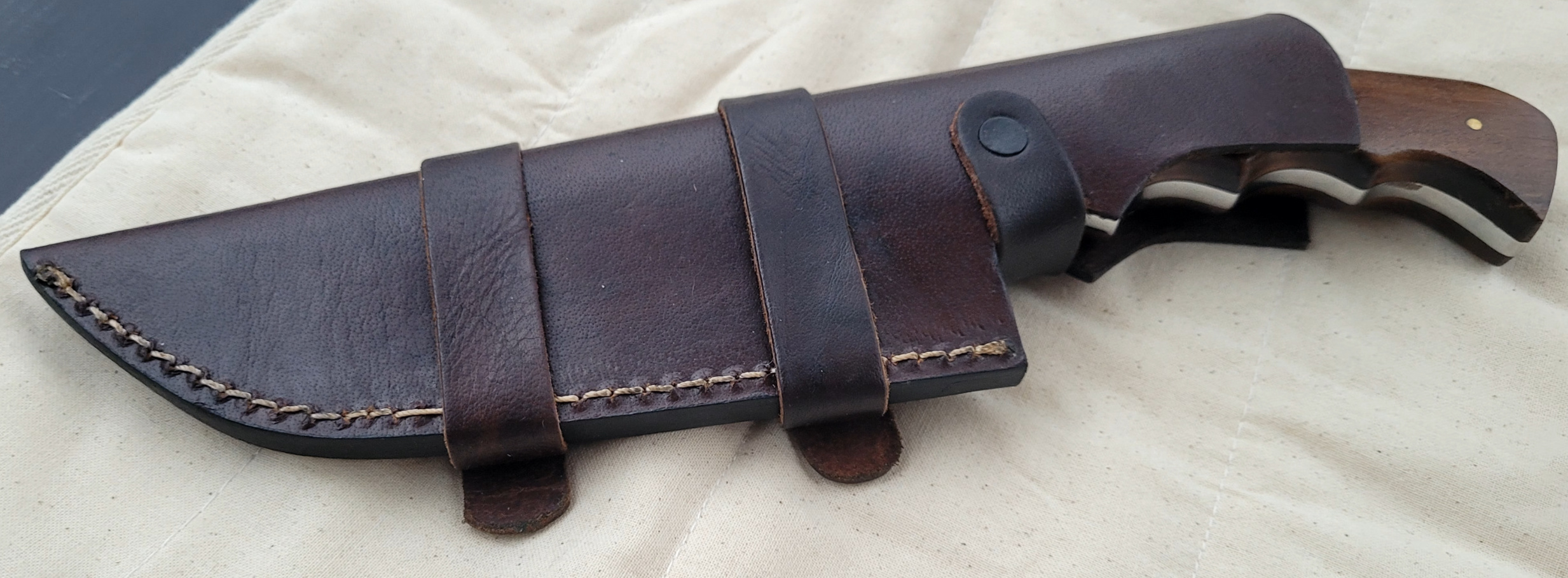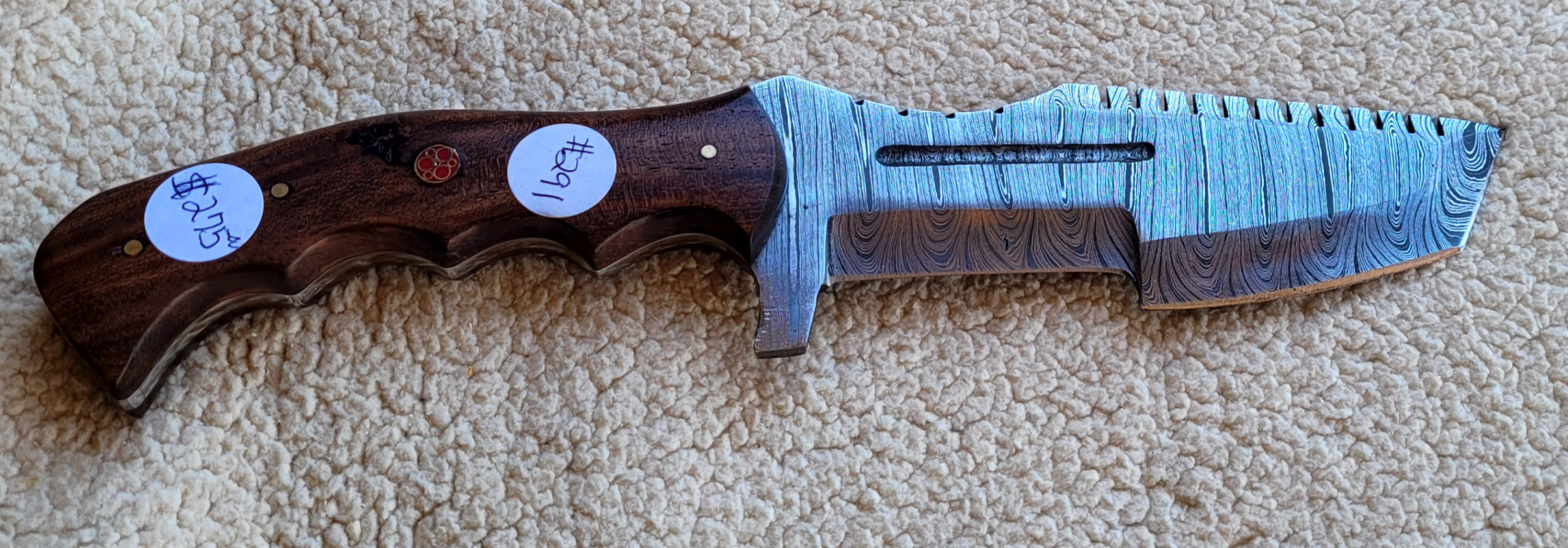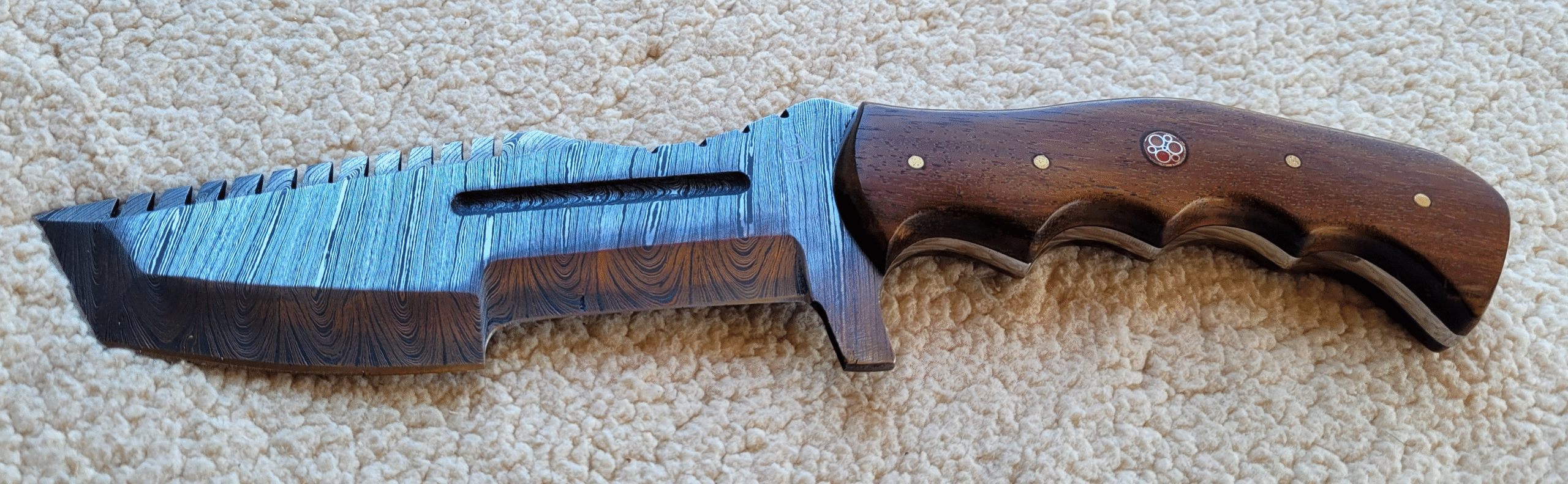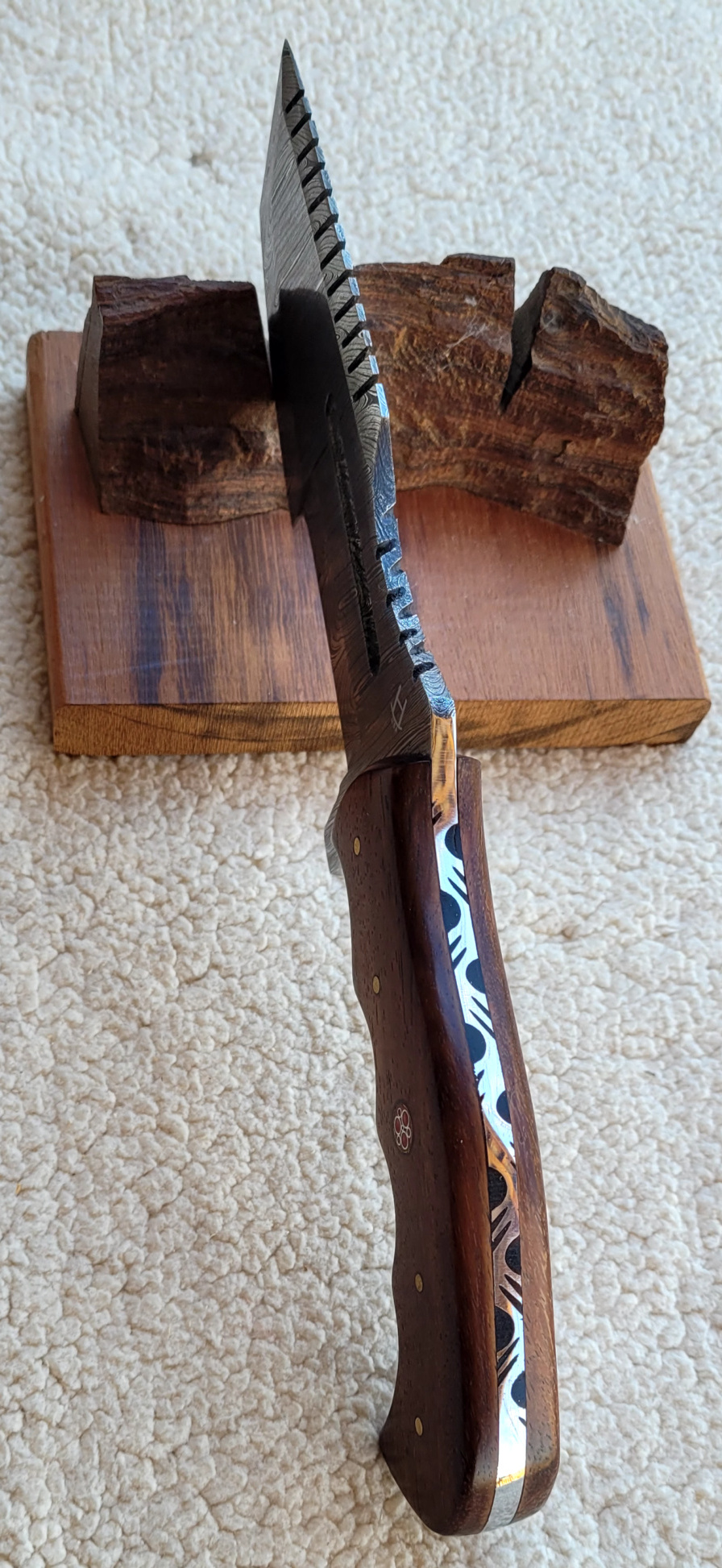 Handmade damascus survival tracker style knife with walnut handle. Damascus has 512 layers of 1095 high carbon and 15N20 nickel. Handle has one large mosaic pin in the middle and 4 brass pins. Blade length is 5 5/8″ with an overall length of 10 5/8″. The rounded portion of the blade is made for chopping (in conjunction with the “cut out” portion of the bottom of the blade. The “teeth” along the top of the blade are made for pulling, ripping or cutting. Great all around camp knife. Comes with a sheath made to be worn horizontally.
